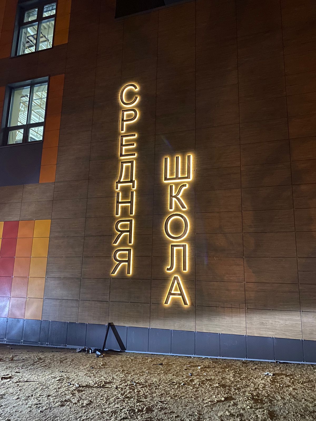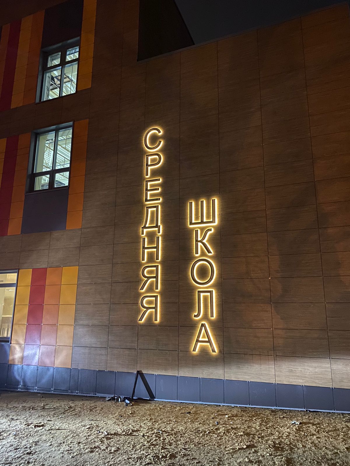 В вывеске из объемных букв контражурная подсветка часто дополняется лицевой. В этом случае переднюю панель делают из молочного акрила, а заднюю — из прозрачного, к которому крепят светодиоды. Цвета на разных частях буквы также можно комбинировать.