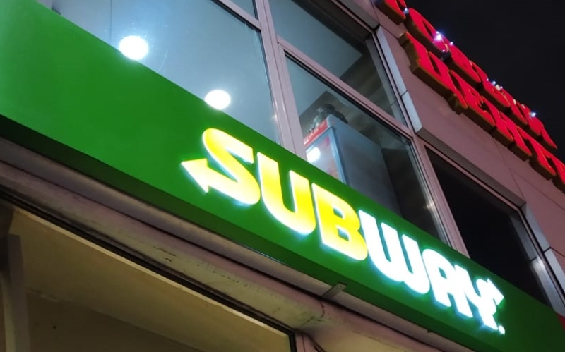 Для подсветки использовали светодиодную ленту нейтрального белого света 5000 К. Ленту закрепили на внутреннюю часть задней панели буквы, а стыки для защиты от влаги залили жидким пластиком Cosmofen. Блок питания с уровней защиты IP67 спрятали в антивандальный короб за вывеской.