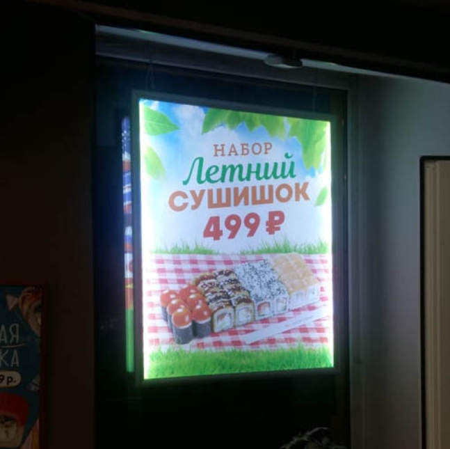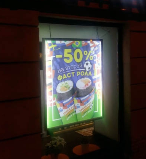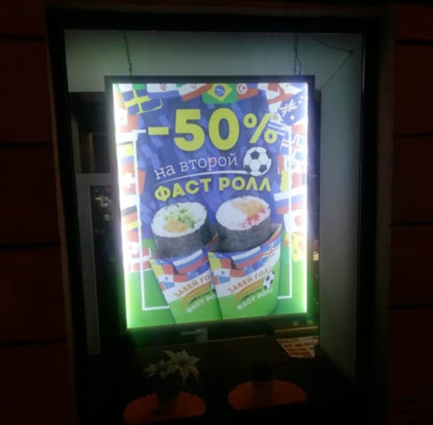 После согласования технического задания были изготовлены панели размером 80 × 110 см с прочным алюминиевым профилем толщиной 25 мм. В основе — акрил с внутренней лазерной гравировкой, формирующей светорассеивающую сетку. Подсветка реализована по технологии LED Edge Lighting: светодиоды по периметру обеспечивают равномерное и чёткое свечение. Информация размещена на плёнке Backlit, позволяющей добиться высокой цветопередачи и контрастности при подсветке. Благодаря откидной рамке, замена постеров занимает минимум времени и не требует демонтажа панелей.