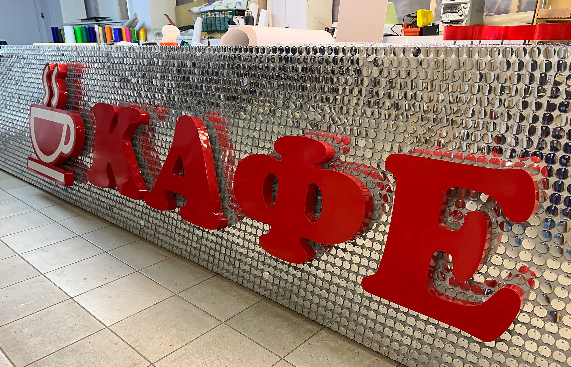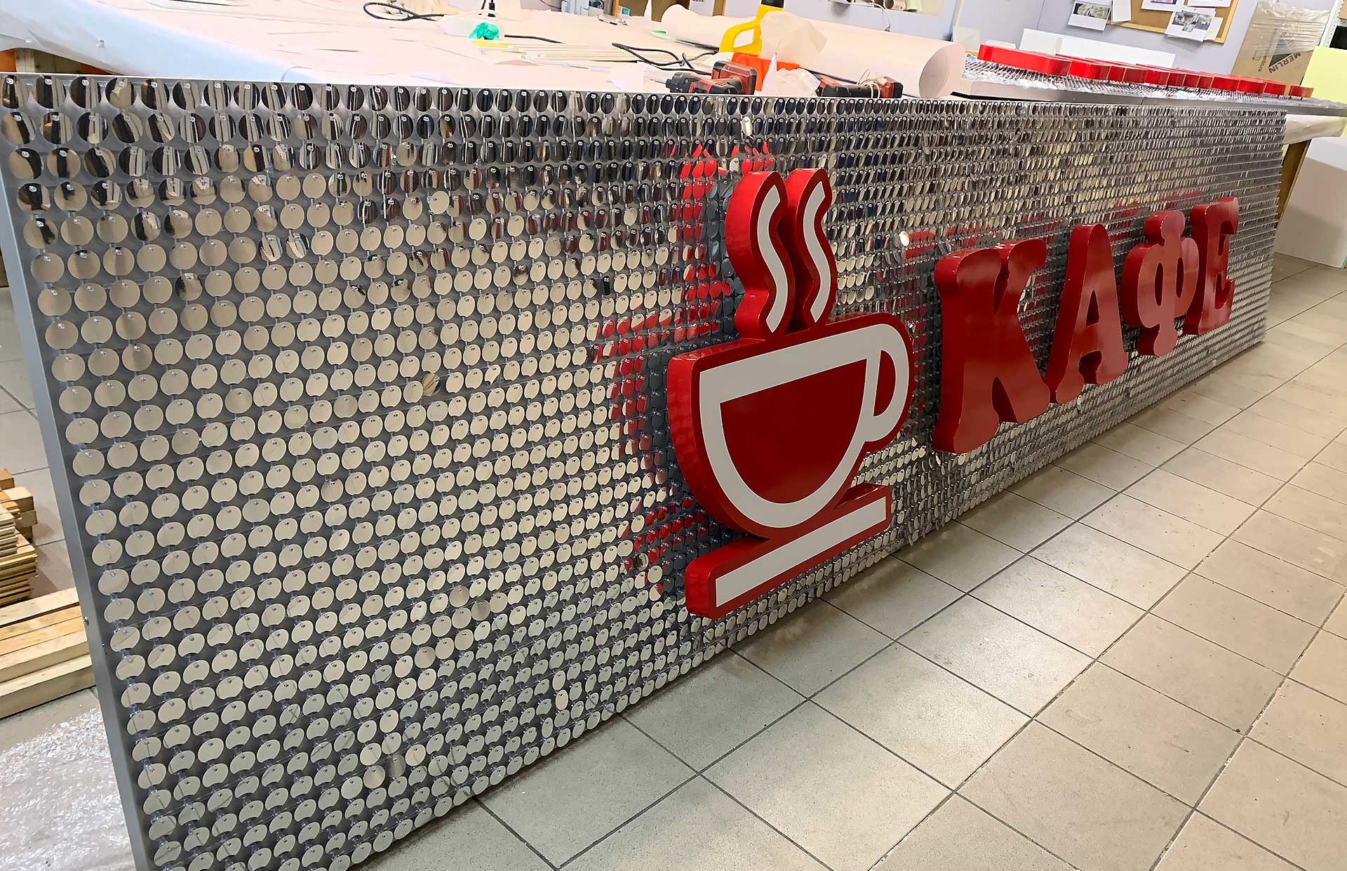 Основной фон состоит из пайеток, которые закреплены на прочной основе, покрытой защитным слоем для долговечности. Пайетки создают эффект блеска и текстуры, что добавляет вывеске эстетичности.